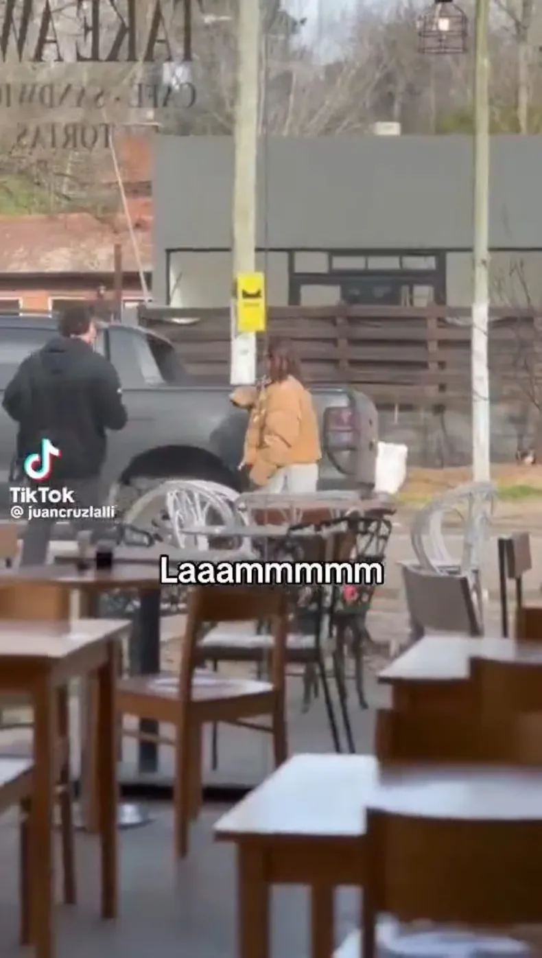 El registro fue tomado desde el interior de un café y muestra a la expareja moviéndose en las cercanías del sector donde, según trascendidos, se encontraba en etapa final la construcción de una vivienda.