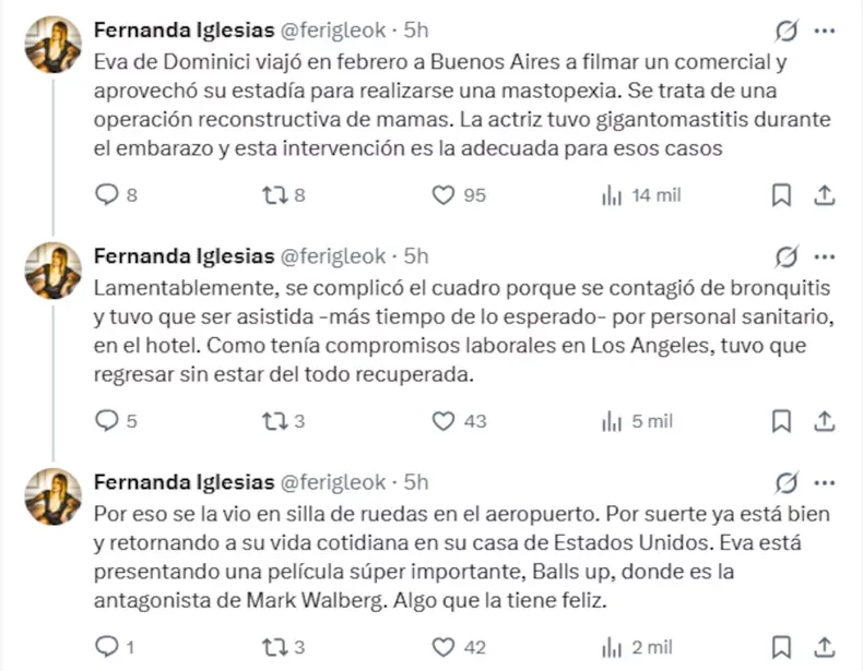 De acuerdo con los detalles aportados, Eva viajó a la Argentina en febrero con el objetivo de cumplir con un trabajo publicitario. Durante su estadía en Buenos Aires, donde filmó un comercial, aprovechó para realizarse una intervención estética de tipo reconstructivo.
