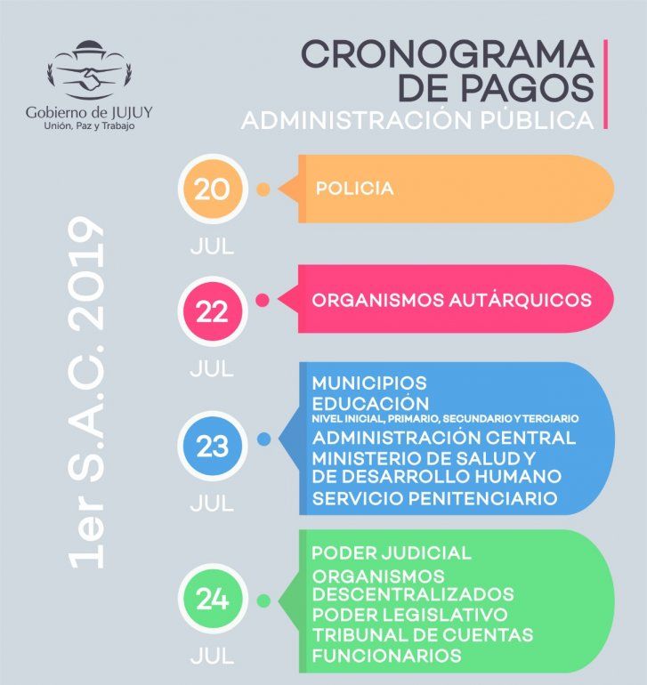 Esta mañana Tesorería de la Provincia de Jujuy difundió el cronograma de pagos de la primera parte del Sueldo Anual Complementario 2019 para los empleados de la administración pública.
