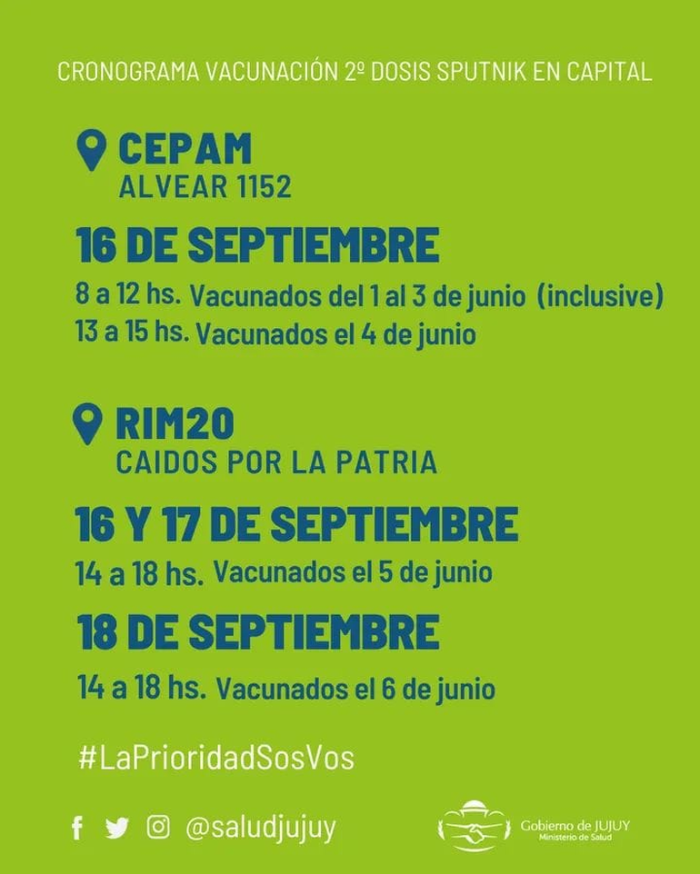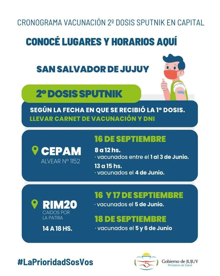 En Jujuy la cita será en el CePAM y el RIM 20, según el día de junio en que las personas hayan sido vacunadas con la primera dosis de Sputnik V.
