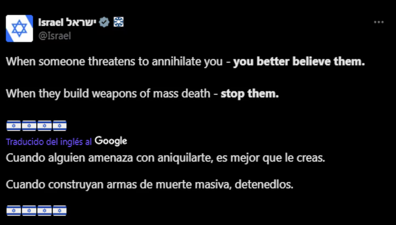 "Cuando construyan armas de muerte masiva, deténgalo" fue la publicación en redes sociales.