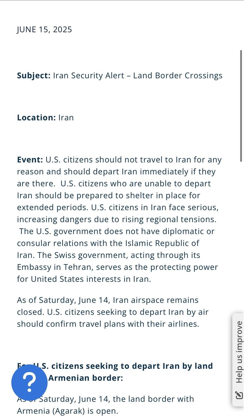 El mensaje fue difundido oficialmente el domingo en el sitio del Departamento de Estado, donde se señaló que el conflicto entre Israel e Irán ha provocado interrupciones en el tránsito aéreo y cierres periódicos del espacio aéreo en la región