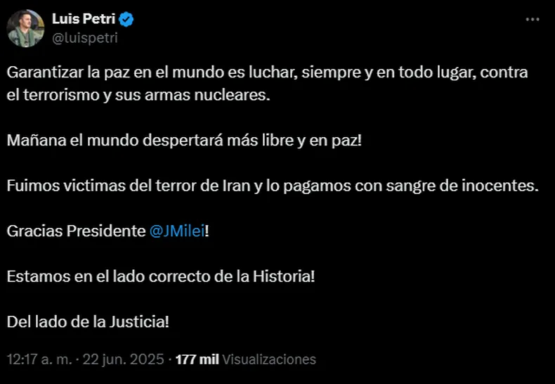 Tras el bombardeo ordenado por el gobierno de Estados Unidos sobre tres centrales nucleares clave en Irán, el Gobierno argentino expresó públicamente su respaldo a la gestión de Donald Trump. La posición oficial fue compartida en redes sociales por altos funcionarios del Ejecutivo y luego replicada por el propio presidente Javier Milei.