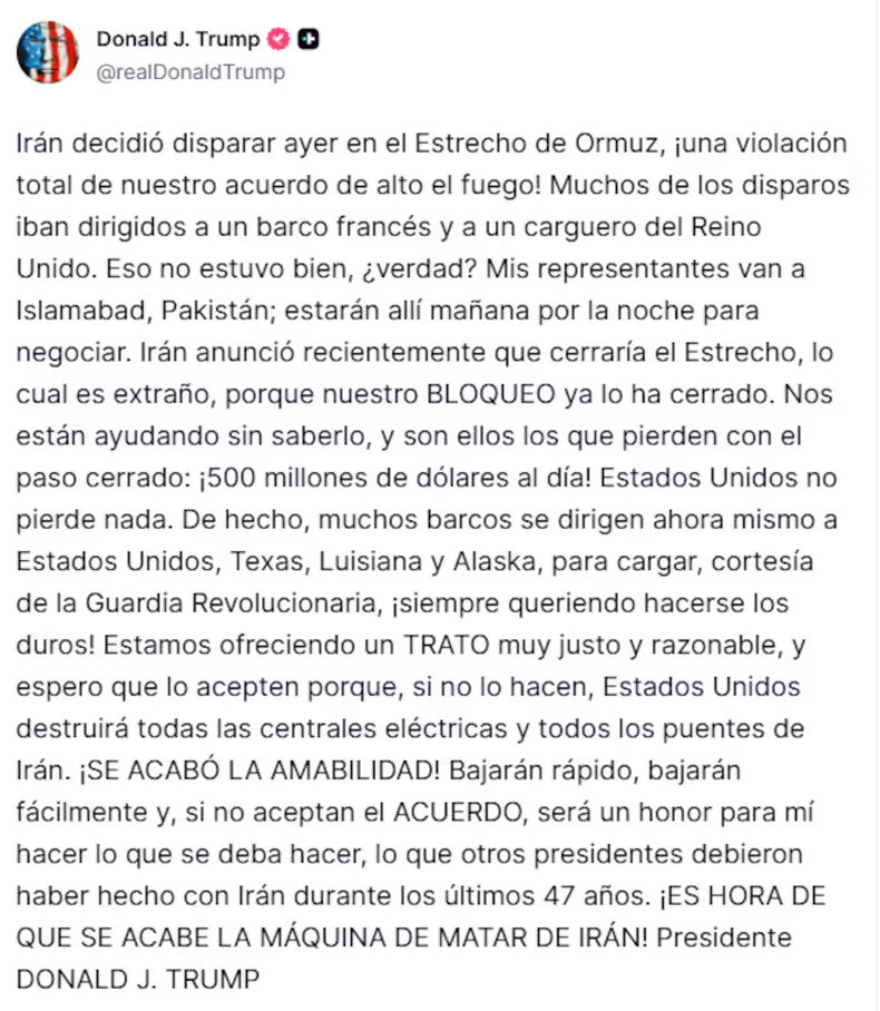 Del lado iraní, el presidente del Parlamento, Mohammad Baqer Qalibaf, advirtió que la reapertura del estrecho de Ormuz está condicionada a la retirada del bloqueo naval estadounidense. En su mensaje, sostuvo que no es posible avanzar mientras se siga violando el alto el fuego y acusó a Estados Unidos de perjudicar la economía global. También denunció la continuidad de ataques israelíes en Líbano.