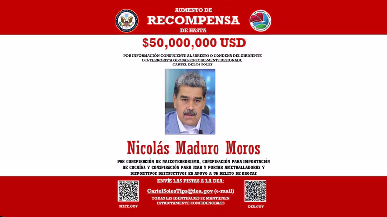 La fiscal general de EE.UU., Pam Bondi, informó que el gobierno de Donald Trump duplicó a 50 millones de dólares la recompensa por la captura del dictador venezolano Nicolás Maduro, anteriormente fijada en 25 millones. A través de un video en sus redes, Bondi afirmó que Maduro colabora con grupos criminales internacionales.