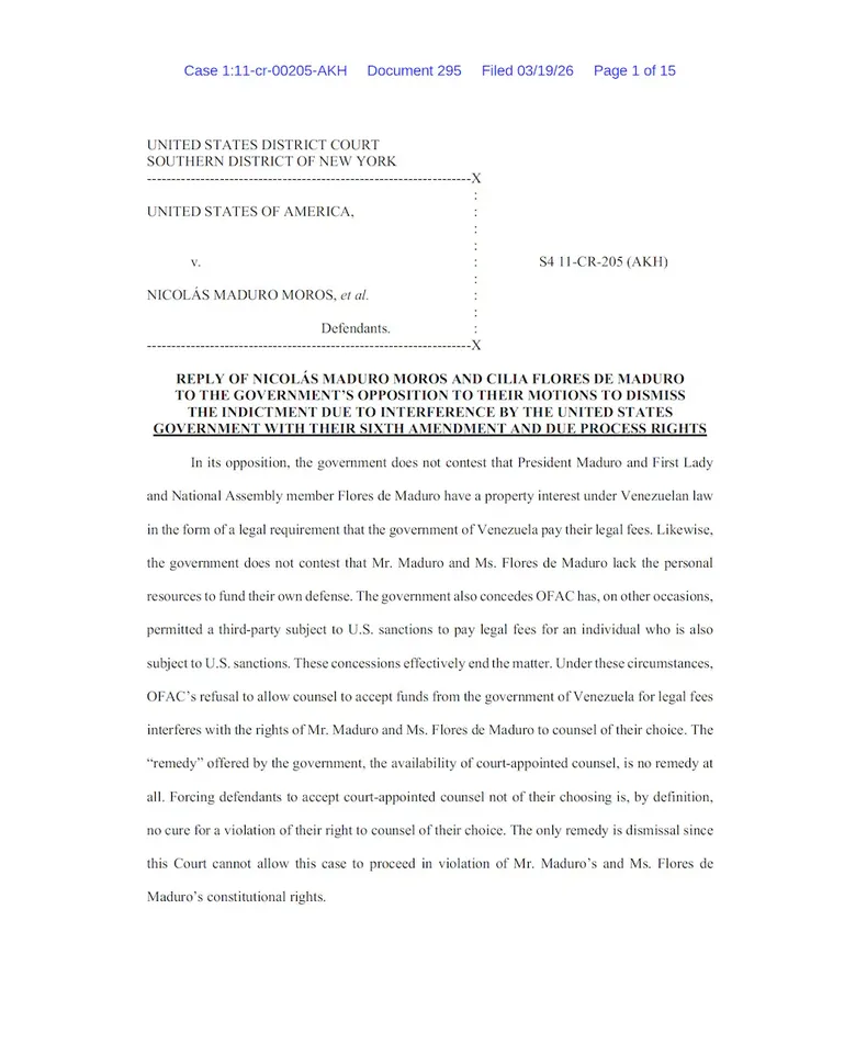 -“La ley venezolana otorga al Sr. Maduro y a la Sra. Flores de Maduro un derecho de propiedad sobre el pago de sus honorarios legales. La revocación de las Licencias Originales por parte de la OFAC y la negativa a restablecerlas interfiere con su derecho a contratar al abogado de su elección ya que, sin la capacidad de ejercer este derecho de propiedad, ninguno de los dos tiene la capacidad de financiar la defensa por sí mismos. Ver Declaración. de Nicolás Maduro Moros (ECF No. 290-2) y Declaración. de Cilia Flores de Maduro (ECF No. 293-2) (declaraciones juradas de incapacidad de pago y disposición a presentar declaraciones financieras a petición de la Corte)”, afirma Pollack en la foja 4 de su presentación.