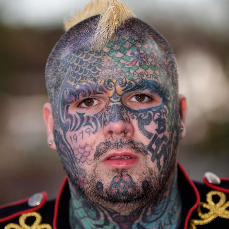 Las fotos reflejan su transformación de un joven común a una figura emblemática conocida por tener todo el cuerpo cubierto de tatuajes, ojos pintados de negro, orejas alteradas y sin pezones. En febrero de 2016, durante la Needle Gangsters Tattoo Expo en Derby, logró un récord al ser tatuado simultáneamente por 36 artistas, consolidando así su fama dentro del ámbito del arte corporal.
