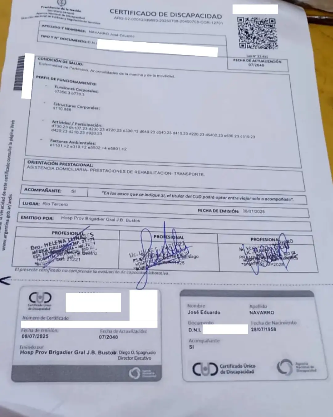 En el documento oficial, se lee su condición de salud: “Enfermedad de Parkinson. Anormalidades de la marcha y de la movilidad”. El CUD se encuentra actualizado con fecha de emisión del 8 de julio de 2025 y lleva la firma de Diego Spagnuolo, ex titular de la Agencia Nacional de Discapacidad (ANDIS) y vence en 2040. Esto significa que fue emitido por el actual gobierno de La Libertad Avanza.