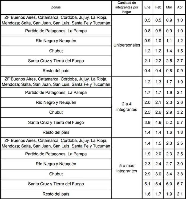 Detalle de los montos vigentes del subsidio de la garrafa social del Plan Hogar pagados por Anses.