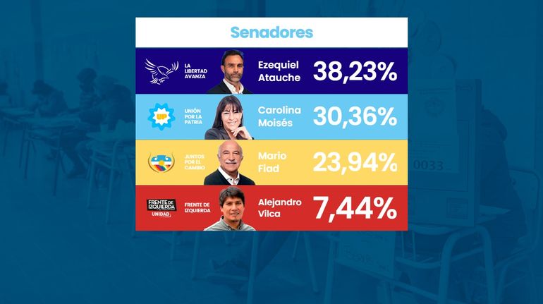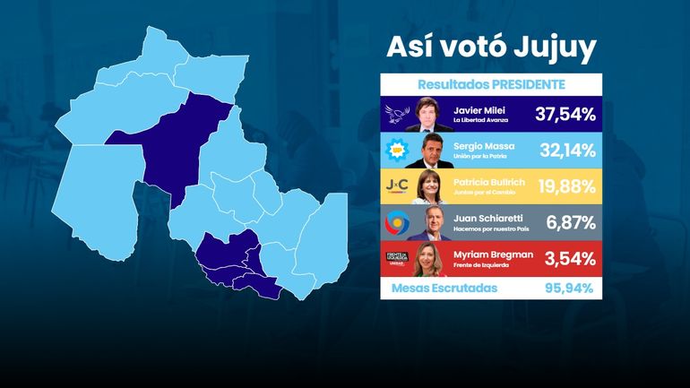 Con más del 95% de las mesas escrutadas tras las elecciones 2023 del domingo, en Jujuy se impuso Javier Milei con más del 37% de los votos para presidente. Mirá los resultados en senadores, diputados y Parlasur.