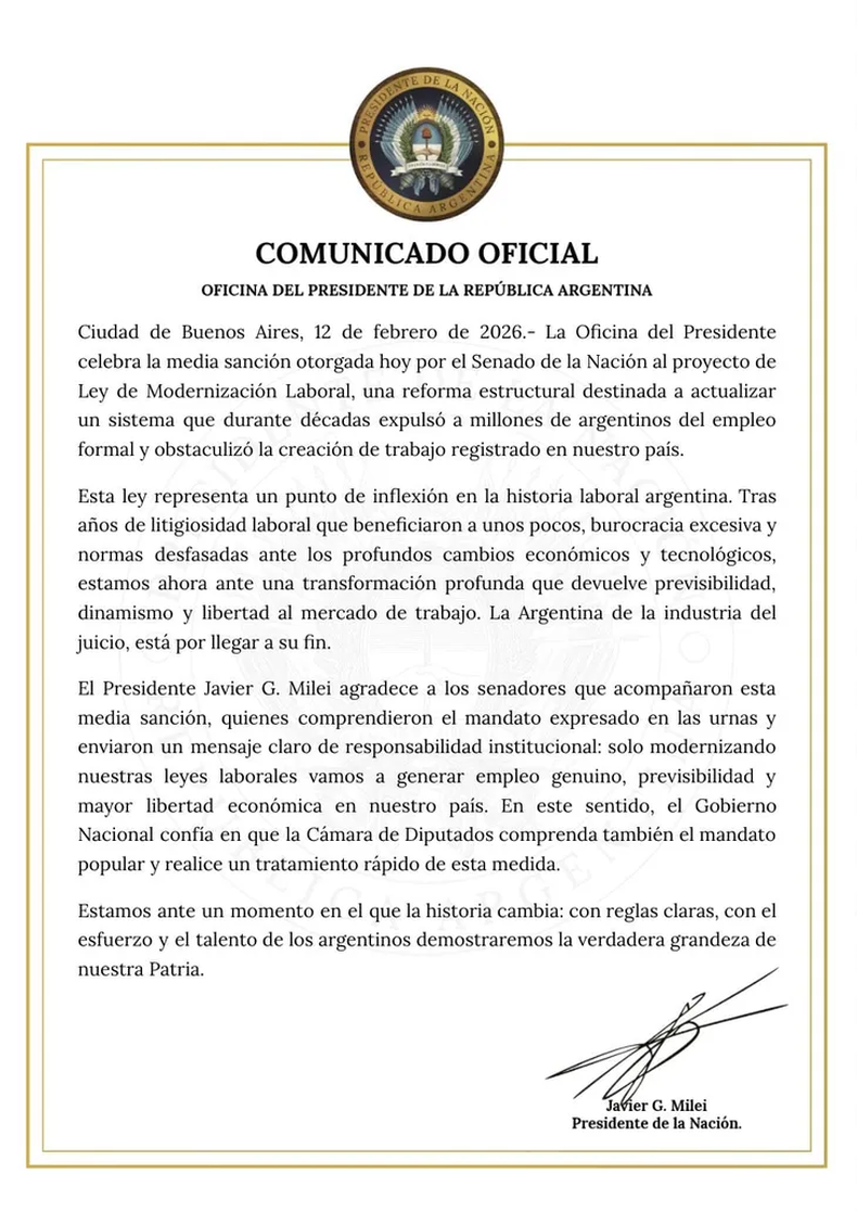 El presidente Javier Milei festejó la aprobación en la Cámara alta de la iniciativa de reforma laboral y definió la votación como un hecho “histórico”, luego de que el proyecto obtuviera media sanción con 42 votos a favor y 30 en contra. El jefe de Estado subrayó el acompañamiento parlamentario como un avance clave dentro de su programa de transformaciones de fondo.