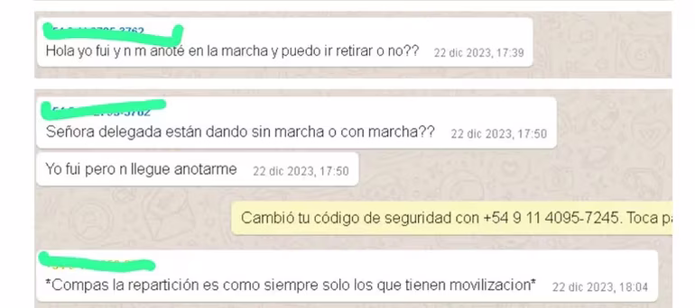 En una conversación adicional, Vásquez admite que “son muy pocos los que movilizan por conciencia” y, por eso, hace que la “marcha” a la que antes “invitaba”, pase a ser “obligatoria” y cuente “como movilización”. “De ahora en más yo dejo de ser permisivo”, indicó. Además comunicaron que se procedería con una “recategorización” (de “beneficiario común” a “lista de espera”). En esta otra captura se ve que se había compartido una “invitación” a una “movilización” y, ante la duda, una de las víctimas pregunta si esa “movilización” es “obligatoria” o “solo para los interesados”.