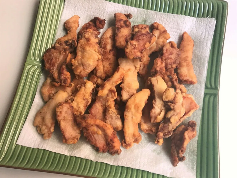 En esta preparación, las piezas de pollo se cubren con una mezcla de harina de trigo, fécula de maíz y un poco de polvo de hornear, logrando así un rebozado ligero y esponjoso que mantiene su crujiente gracias al uso de agua con gas y la técnica de doble fritura.