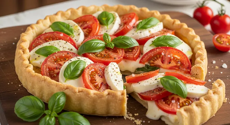Esta versión vegetariana de la tarta caprese se elabora con masa de tarta, tomates frescos, mozzarella y hojas de albahaca.