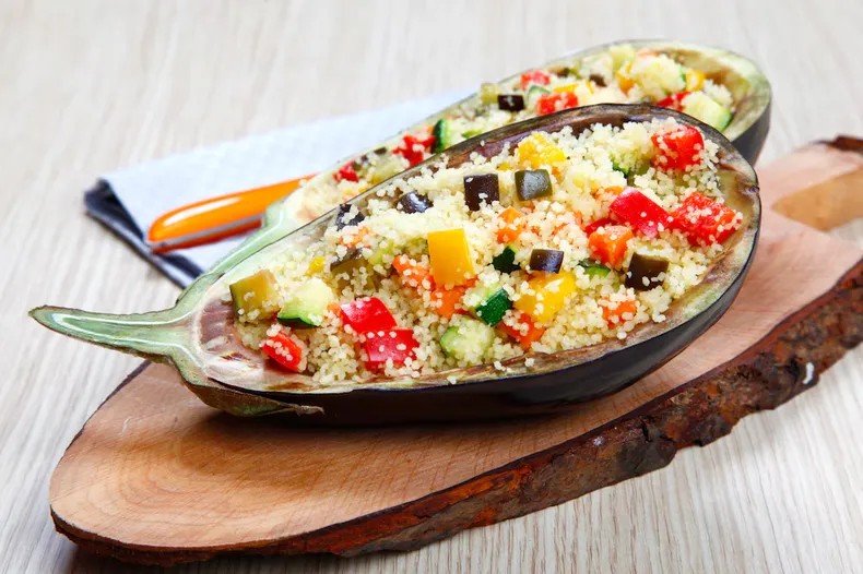 La berenjena rellena de cuscús se compone de mitades de berenjena asadas y vaciadas, rellenas con una mezcla de cuscús hervido, pulpa de berenjena y verduras salteadas con especias.